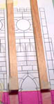 | 7. | New we'll assemble the corner pieces of the tower. Tape down a straight edge onto the plan. Glue the blocks together as shown. The plans also include a detailed drawing of the blocks for this corner section (it's hard to tell from this picture exactly what blocks go where). You will need to make four of these corner sections. |