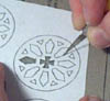 | 5. | The doily window. For this window I picked up some doilies at a craft shop. Cut out the window template and center it over a part of the doily you want. Draw around it and cut it out with scissors. Spray paint the piece white and paint it using the stone color. Since most doilies are embossed, they make a nice effect when you dry brush the lighter colors on. The doily window is the easiest (no cutting), but you might have a hard time finding some with the type of decoration you like. |