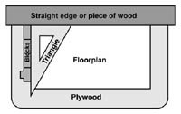 | 4. | It's always best to place all of the blocks down first so you can see how they fit. A few edge blocks will need to be trimmed (as shown on the floorplan). You may also need to sand an occasional block so they'll line up correctly. To help me get the blocks straight, I placed a straight edge along the top of the plywood (a 1x2 board works nicely) and used a triangle as a guide while placing the outer ring of decorative blocks down. Once the outer ring was glued down, I glued and placed the floor tiles inside. The same was done for the opposite half of the floor plan. |