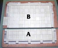 | 1. | Lay the floor sections A & B together (don't glue them). Start by placing and gluing the pieces shown here. Since you've already done a pre-fit of the model, the pieces should fit together alright. |