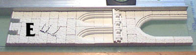 | 7. | To build item "D" follow the plan and line up the blocks against a straight edge. Place another straight edge on the other side and press together while the glue is still wet. Pre-glue the decorative trim onto blocks (center photo) for the inside of the doorway. When dry, finish the doorway at the bottom. The piece will be especially weak at the red arrows! Be sure to handle it carefully. If it breaks here, just leave it in two pieces and wait until assembling the main pieces before gluing it back. Make two of these. Label them with a permanent marker. | ||