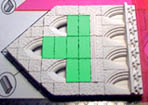 | 19. | The decorative top trim on this is tricky. Place some floor tiles and square blocks as shown in green. Do not glue these. Place and glue the decorative top trim in the open areas that are left. You will have to trim a few pieces down to fit. |