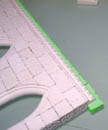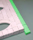 | 16. | Place floor tile blocks against the top edge (shown in green). Do not glue them. Place and glue the decorative edging along the top of the wall. Do not glue it to the green blocks! |