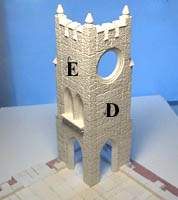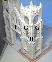 | 3. | Place and glue the remaining tower pieces "G" and "H". Be especially careful with the small roofed decorations. They're very easy to knock off. Once glued, hold the towers together with thin wire wrapped around or a rubber band. A slow drying glue is sometimes a good idea. It will give you time to push and shove the pieces into alignment. A little bit of give in the pieces is needed sometimes. The lower photo shows how the two halves of the cathedral can still come apart to view the inside. |