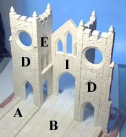 | 5. | Set in and glue the buttress arches "T" (the ones with no decorative top trim). These will support the roof over the gallery. Now place and glue the top buttress arches "S". Don't be afraid to push on the tall supports on piece "L". You will have to push and twist the wall section slightly to get the buttress arches to fit right. |