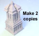 | 16. | We'll finish this wall section by adding the decorative blocks shown. The torch, pillars and small arches are all from mold #45. You may have to sand the pillars a little or they will end up being too tall and the decorations will stick up above the wall. Center these decorations between the windows as exactly as you can. Be sure to make 2 copies of this wall section. |