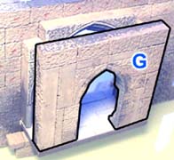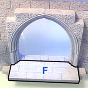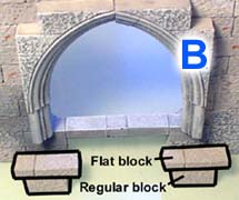 | 14. | When positioning the column tops, the center of the column should be 1/4" away from the nearest block joint. Add an arch onto the back of the wall. Do not glue the blocks in red. |