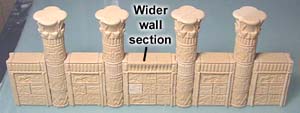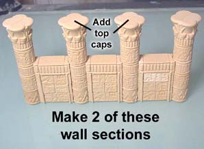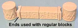 | 4. | The connecting walls use the blocks with hieroglyphs on them. When I made these walls, I tried to vary the block designs so there wouldn't be a repeating pattern. The top decoration blocks are the ones with designs on both sides of the block. If you want to be sure the rounded part of the end blocks are straight on each end of the wall, you can use a 3/4" dowel rod as a guide. |