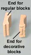 | 2. | The end blocks are used to tie round columns into straight walls. There are two kinds of end blocks shown in the photos. Once end blocks are put on each side of a column, the width becomes 1" across. This makes it easier to plan buildings in even measurements. |