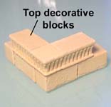 | 5. | You will need 1 connecting wall that is wider than the rest. For the top of this wall, you will use the decorative top pieces that have a design on one side. The reason you have to use them here is because there are no 1/2" long blocks with a design on both sides. However, I guess you could sand a block down to 1/2" long, so that this wall segment would match the others if you wanted to. This way is just easier to build. |