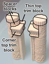 | 10. | Now glue the small blocks on top of the plain ring of blocks using the spacing shown. At this point, all of the temple pieces are built and you need to paint them before gluing the temple together. |