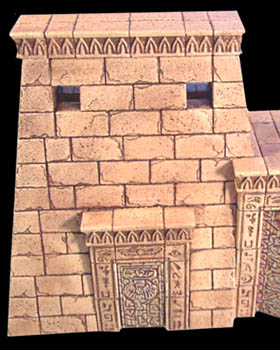 Here are finished photos of the Egyptian Pylon. The last photo shows what the pylon looks like if you use the alternate tower face design which has the symbols turned out where you can see them. For instructions on painting this model, refer to the Antiquing Method shown on the painting instructions page. Instructions for making the doors are found on the Tips & Tricks 16 page. They're made of aluminum foil which is embossed with an ink pen and antiqued using brown shoe polish. |