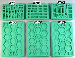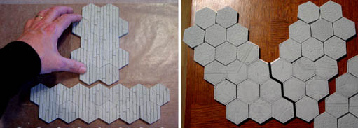 | 2. | Be sure there is no "flash" on the edges of the hex tiles. You usually will not have this problem if you scrape the face of the mold clean when scraping. If you have any material sticking out around the sides of the tiles, be sure to scrape it off. Otherwise the tiles will not set flat together. |