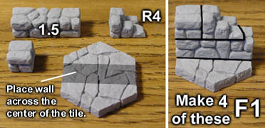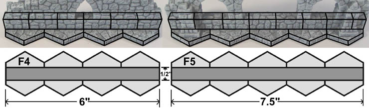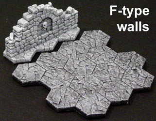 F-type WallsThese wall types span from flat to flat across the hex. There are 1/2" wide walls centered onto the hexes. If you want to expand your set beyond what is shown in these instructions, it will be easy to use any type of wall style for these walls such as rubble stone, half-timber and stucco. However, if you do create new walls for the set, it's important to not make the walls go up too high. If the walls are too tall, you will not be able to see the figures or markers on the game board to play the game. |
