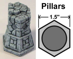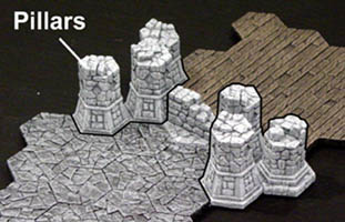 | 3. | PillarsPillars fill the entire hex You can pretty much use anything you want to completely fill a hex but I have made mold #702 especially for this purpose. Pillars are extremely useful for filling up all of those odd places where the other wall sections just don't fit well. You can even completely surround a room using pillars alone. I have included a lot of these in this set especially for that reason. |