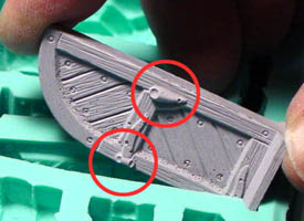 | 3. | One piece that may give you trouble when casting is the round topped door on mold #702. This door is cast on end and sometimes it's difficult for the mixture to get down into the details without getting air bubbles on the hinges and handle. Here you can see an example of the hinges and handle with air bubbles. |