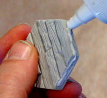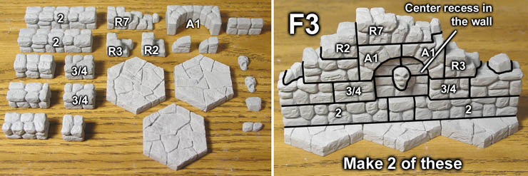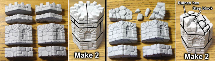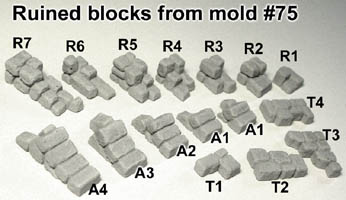 | 24. | The ruined blocks on the hex pillar mold #702 will fit into each other. Just take two of the ruined blocks and stack them together face to face to form a half hex that's 1/2" tall. Three of these half hexes are stacked together to make the bottom left photo. The final photo shows one of the step blocks used along with single stones to make the ruined side of the pillar. Make 1 of these. |