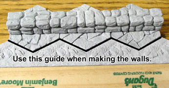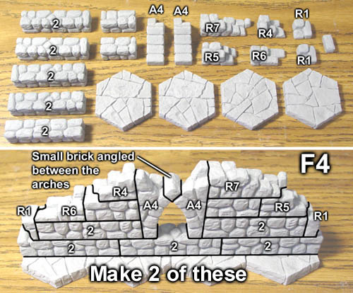 | 5. | I've included this chart to help you identify blocks from mold #75. Click on the photo for a larger view. I suggest that you print out this photo and use it as a guide when trying to pick out the blocks for each wall section. Most of the arch blocks (A1-A4) will be glued together using four blocks to make one full arch. However, there are a few wall sections where single blocks are used so do not glue all of the arch blocks together at the beginning. |