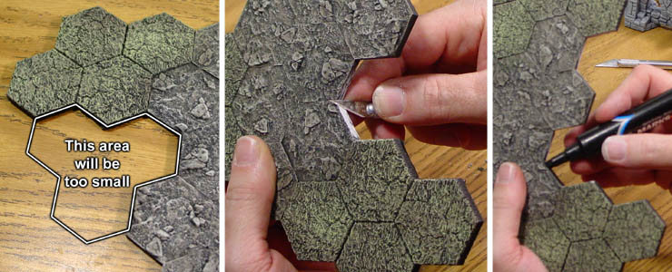 P-type WallsThese wall types span from point to point across the hex. There are 1/2" wide walls centered onto the hexes. You want to be sure that these walls do not extend past the boundaries of their hex. If they do, then you will not be able to place a pillar in the hex adjacent to it. You will notice that the smallest wall section is just a bit too long and extends past the hex on the left side (photo on the left). You can fix this by chipping away at the wall corners until it fits in the hex. You also want to fill in the end hexes as much as possible. You can do this by adding a column, buttress or pieces of rubble to fill in the space. This is not absolutely necessary but it will give the illusion that all of your walls connect. |