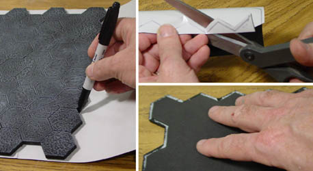 | 4. | Use these guides when making the wall and floor sections so the edges of the hexes will line up properly. This photo shows how the guide is used to make the F-type wall section. |