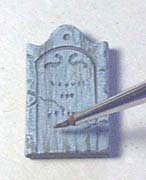 | 4. | To paint the tombstones, I sprayed them with gray primer. Then I dry-brushed them with light gray paint. To add weathered effects, I used a combination of black and brown ink wash (thinned with water) and streaked it down the front. |
