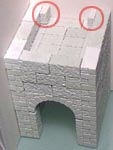 At this point I discovered a problem. It appears that the arch pieces are too short and leave a gap under them. After some thorough searching I discovered what the problem was. It also happened to me on the Wizard's Tower's arrow slits. When you scrape off the blocks (while casting), they end up a little taller than they should. All of my original blocks measure exact within 1/1000th of an inch. But depending on how hard you scrape off the mold, their height can change. Usually you don't notice it because you build with the flat side of the block down. Since all of the blocks are too high by the same amount, they line up straight. But when you turn a flat block on its side, it doesn't have the height increase and appears short. To remedy this, you might sand down one of the longer flat blocks to fit (where the green ones are). Make them a little taller to fill the gap. For this model, I cut a piece of thick card stock and glued it in the gap later on. |
