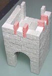 | 1. | You can download the plans shown here from the Building Plans page. I'm using a special type of casting material for this tower called "dental plaster". To find out more about it, check out the Casting Instructions page. It has a greenish cast to it. The prison tower mold has special blocks with a brick design on one corner. These are specially made to put an alternating brick pattern on the corners of the tower. If you stack the blocks so the smooth flat bottoms are down, the corner pattern won't work. Flip the top block upside-down and the pattern will work. As a rule, when you want the pattern to line up, just position the block so the pattern is on the outside corner and it will work out correctly every time. |