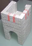 Here's a close up of the backside of the tower. The 1" ledge is wide enough to set most miniatures. These miniatures shown here are Warhammer(TM) miniatures. The small arch (1/4 wide opening) and the large arch (1 1/2" wide opening) are new sizes and don't appear in any other mold as yet. The rounded arches are very useful. Form a circle with four arches, lay them on their side and you have a round pit in the floor. I eventually plan to have various sizes of round towers that will match up with these arches to form vaulted ceilings or deep round pits. |