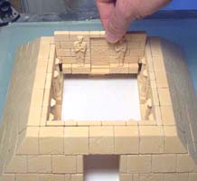 | 9. | This photo shows the third level in place. You will notice support blocks under this level as well. Simply stack 2 of the square pyramid blocks for these. This time you don't have to lay the inner chamber blocks on their side. Just stack them up normally. |