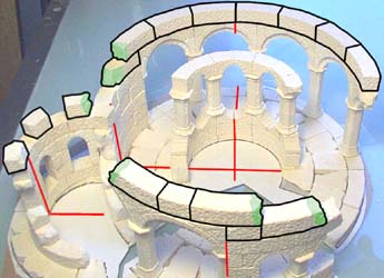 | 7. | Assemble and glue 5 large arches and 2 half (broken) arches. Also glue 5 complete columns and 1 broken column (using long and short column pieces). |