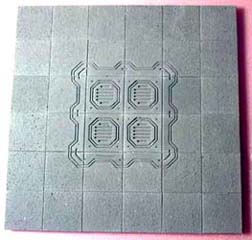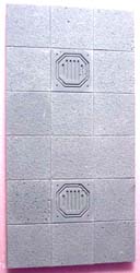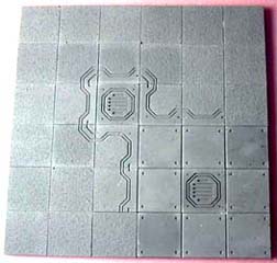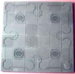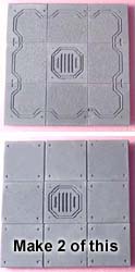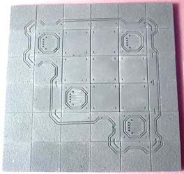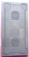 | 3. | To base these starship rooms, I'm going to mount the floor tiles on pieces of 1/2" thick polystyrene foam insulating board. This is the stuff they use for sheeting on houses before they put siding on. You can get it at most lumber yards and usually comes in pink or blue. The main advantage is that it's stiff and doesn't warp easily. It's also easy to cut (with a sharp knife), and you can make pits and holes in the floor that actually look deep. |