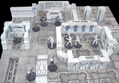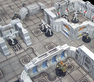 The floor sections and rooms can be easily rearranged into any kind of layout you want. As long as any additional floor pieces are based on a 3x3 size, then everything will fit together correctly. Here are a few photos of the finished pieces arranged in simple layouts. The Star Wars miniatures are from Wizards of the Coast. For instructions on how the pieces were painted, please visit our Painting Instructions page. To see how to insert colored plastic in the window, see our Tips & Tricks 18 page. |