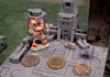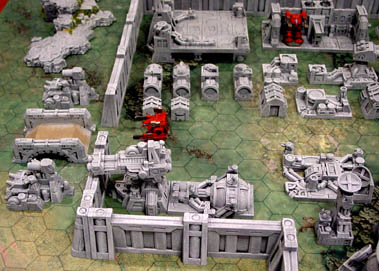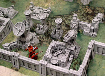 All of the complex buildings and equipment were made using molds #312, 313, 314 and 275. The large surrounding walls you see were made using molds #315 and 415. The mech miniatures you see here are from Reaper Miniatures from their CAV line. The mechs were painted by Matt Leahy. These blocks are originally intended for 1:285 scale or 6mm scale but can also be used for machinery for 28mm figures. Click on the photo for a larger view.  |
