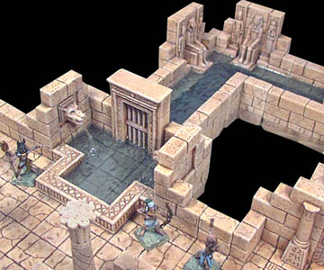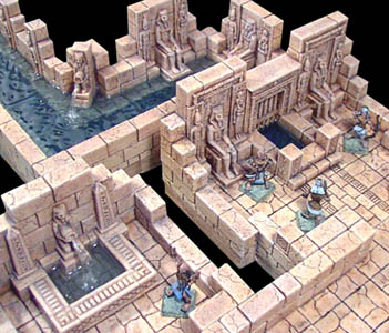 | 2. | Here you can see the statues and doorway sides setting on the edge. Imagine what it would look like if the bottom of the waterway had no edges. The statues would look like they're floating in the water. For instructions on making these waterway sections, go to the Detailed Tombs page. |