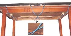 Since two of these boards will cover the table top, I've drawn with a magic marker where one half of the dining room table will sit once this board is on top of it. You want the pipe straps to be located well under the dining room table because we're going to hook bungee cords to these straps, and these bungee cords should reach well under the table in order to work correctly. Finally, place the felt pads around the surface that will set against the dining room table. These felt pads will keep the boards from scratching up your table surface underneath. I originally was looking for some non-skid pads but I couldn't find any that were not awfully expensive. |
