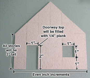 | 1. | All stories will be 3" tall. This is for 15-28mm figures. For other scales you would need to adjust this. Peaked wall sections will be in even inch wide measurements. This is because you want your roof slope to meet at the top corners of your wall. Odd measurements will mess this up. Doorway openings will be 1" wide x 2" tall. We will end up filling the upper 1/4" with planks later on to make the finished door size 1 3/4" tall. Window openings will be 1" tall, in increments of 1" wide and 1" up from the ground. |