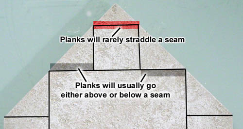 | 3. | Timbers will lay across the seams of the panels. Usually they will go on one side or the other of the seam. Doing this will keep you plank cutting to a minimum. On rare occasions you can use a plank to straddle a seam. However, this may result in you having to trim down the other planks that run into it. |