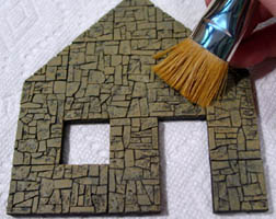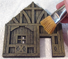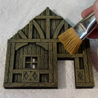Paint all of the wooden timbers at once by spray painting black and dry brushing with medium earth color. |