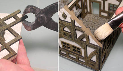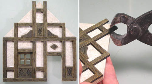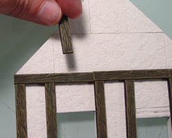 Glue the painted timbers onto the wall. Trim off the excess timbers. |