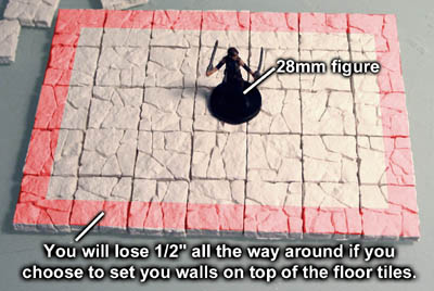 | 1. | Decide the floor area of the house first. I suggest you keep the floor in even inch measurements. Start by placing some floor tiles down and comparing it to the miniatures you are going to use. Keep in mind that you're going to lose 1/2" all the way around if you choose to set the walls down on top of the floor. If you don't have any floor tiles nearby, you can always draw your floor out on a piece of graph paper. |