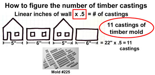 | 4. | Figuring Timber CastingsThis formula will tell you how many castings of the Half Timber mold to make in order to build your house. First you add up how many linear inches of wall you have. |