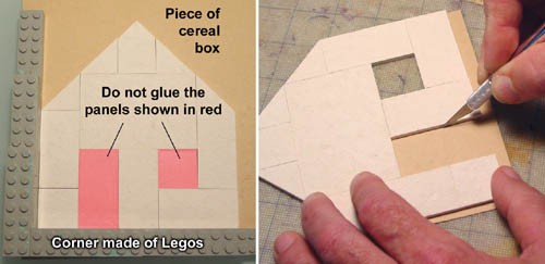 | 7. | Glue all of your panels down to a piece of cereal box. I have used a corner made of Legos to help keep everything square. The red panels are placed smooth side up to hold the position of the door and window. Do not glue the panels in red. When dry, trim off the extra cereal box. |