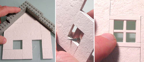| 8. | Glue panels onto the back side of this wall section. The Lego corner helps make sure the panels line up front to back. Once dry, scrape out the window holes to make sure your windows will fit easily. Once these items are painted the window will fit much tighter. |