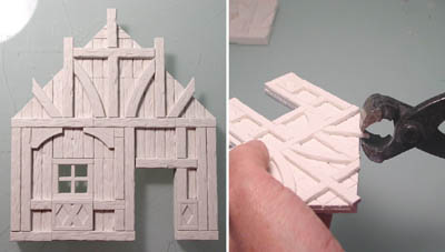 For Those Using the Wood Panel MoldSkip down to the Gluing On the Timbers section. For the wood panel walls only, we will glue all of the planks on before painting anything. Use a pair of tile nippers to trim off the excess planks and sand the roof slopes down smooth. For the other panels molds we will paint the walls and timbers separately before gluing them on. |