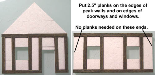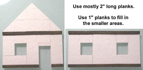 | 2. | Next glue the 2 1/2" long planks vertically on the edges of the door, windows and any seams you want to cover. Notice that we did not put any planks on the edges of the straight wall section (photo on the right). This is because this straight wall will butt up against the peak wall so no edge is needed. |