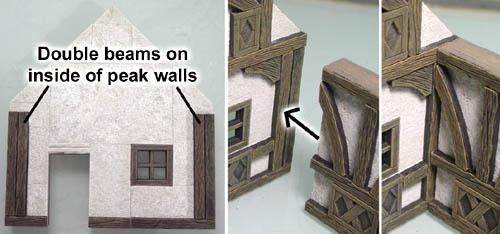 | 3. | On the inside of both peak walls, glue double beams on the ends. This is because you need a 1/2" wide flat surface to mount the side wall onto. |