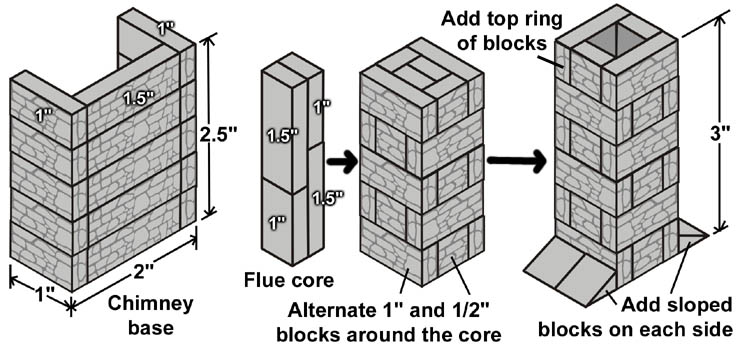 | 8. | In case you might have some difficulty figuring out how to build a chimney for your house, below is a diagram of how the blocks from mold #263 could go together to make a simple chimney. The flue (top of the chimney) will be glued onto the base. I would let each part dry before gluing it all together. I do not have specific plans for each of the chimneys below. The more decorative ones use blocks from mold #259. Feel free to add more decoration or create any type of chimney you like. |