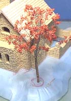 To simulate the fallen leaves under the tree, I'm using some stuff called "Foliage" from Woodland Scenics. You can find most Woodland Scenics products at any hobby or model railroad shop. The foliage comes in a sheet. I cut off a small piece, pulled it apart under the tree and let the bits fall to the ground. Then I sprayed under the tree with a mixture of glue and water to hold it in place. The tree is finished! |