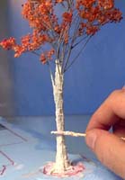| 5. | Stick the tree down into the foam and glue it in place. The kabob skewer makes it easier to push into the foam. Now for the messy part. Take some cheap acrylic caulk and squeeze some onto the trunk. Use a toothpick to spread it evenly on the trunk. |