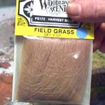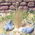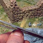 | 3. | To add weeds, I'm going to use a product called "field grass" by Woodland Scenics. Using a paintbrush handle, move the ground foam out of the way until you can see the foam base below. Put a dot of glue down on the foam base. Be sure to use a thick glue such as "Tacky Glue", otherwise the grass may not stand up. Pull out a small bundle of grass. Using scissors, trim the bottom and stick it down into the glue. If the glue is thick enough, it should stand on its own. However, you may have to shove the grass upright occasionally if it falls over. Once it dries it will stand on its own. |